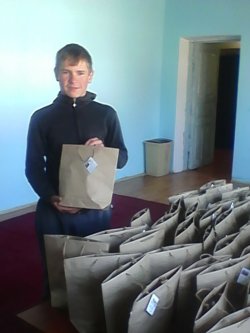 Каракол шаарындагы «Ирада» балдар үйүнүн тарбиялануучулары кагаз баштык жасап, акча таап жатышат