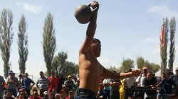 Сокулуктук спортчу М.Ташматов гиря көтөрүүнү чемпион инисинен үйрөнүп жатат